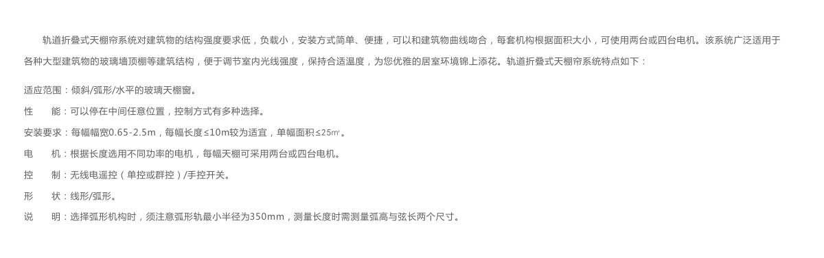 轨道折叠式天棚帘系统用于玻璃幕墙顶棚的室内双轨平动遮阳系统,它可以制成平面,也可以制成圆弧曲面,甚至还可以制成圆形天棚帘。