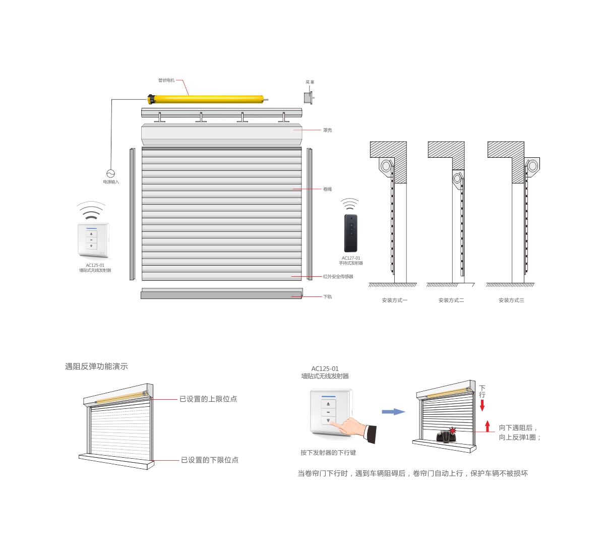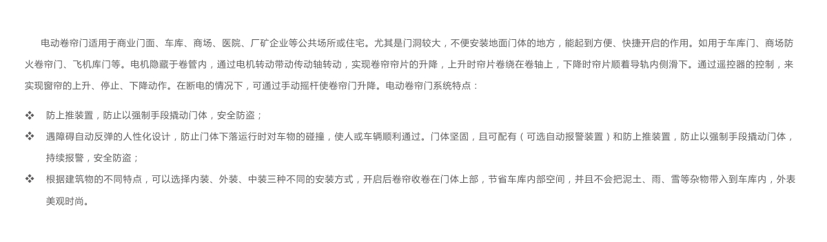 旭彩网 电动卷帘门是以多关节活动的门片串联在一起,起动有电动机组带动,在固定的滑道内,以门上方卷轴为中心转动上下的门。