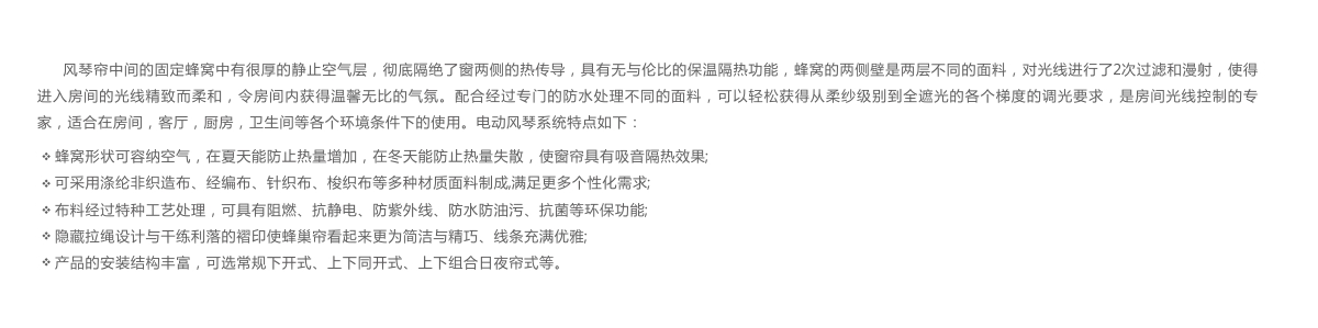 风琴帘又名蜂巢帘, 是风靡欧美的主要窗帘产品之一,因其具有蜂窝状的结构而得名,产品在调光,遮光,保温等各项性能上都有卓越的表现。