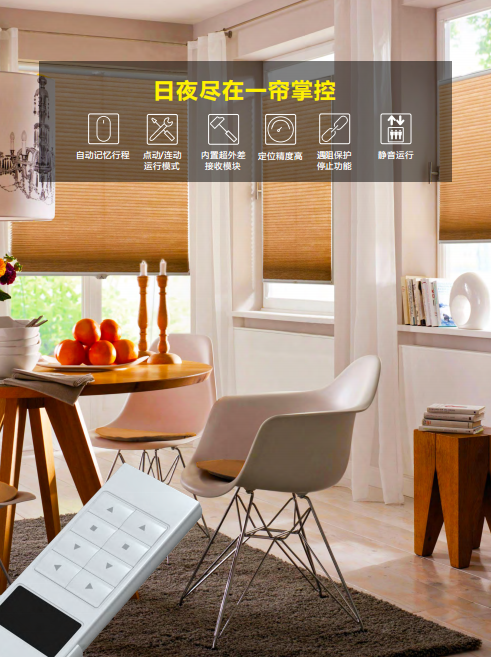 AM24日夜蜂巢帘定位精度高,配备断电行程记忆与遇阻保护停止功能,支持点动和连动运行两种运行模式。内置超外差接收模块,接收灵敏度达到-110dBm。全程静音运行,为您打造一个高颜值高品质的人居生活体验。
