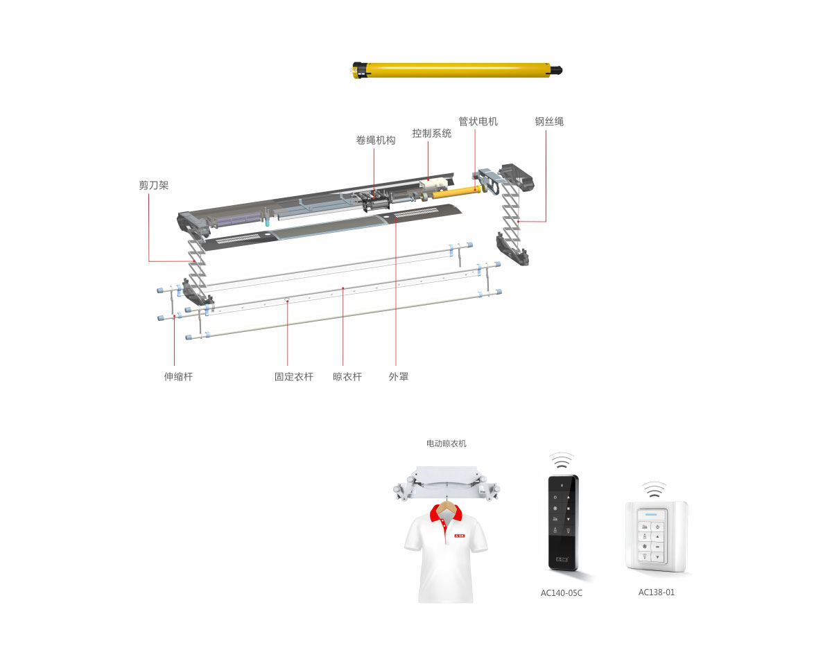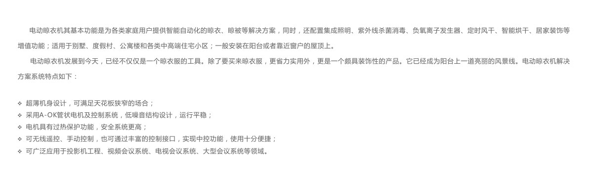 电动晾衣机是一种通过电动机产生驱动力、智能化的家居用品,该电器主要由机身、动力系统、控制系统、升降系统、晾晒系统等组成。
