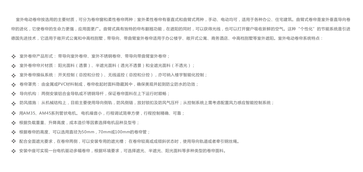 室外电动卷帘具有抗紫外线、环保节能、美化环境、节省室内空间和防风等多种功能。