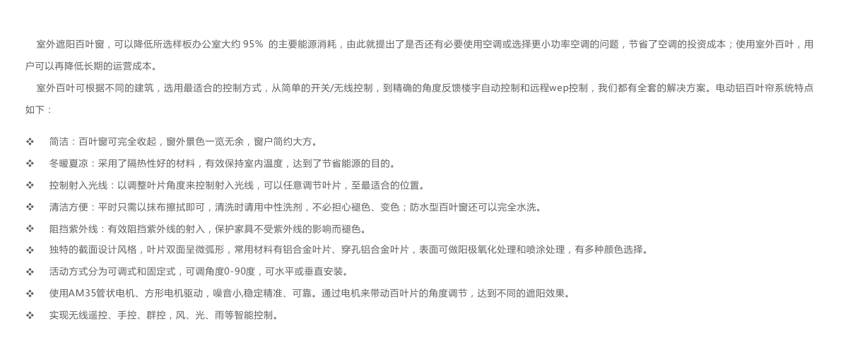 室外电动百叶帘,采用特殊铝镁合金并结合防腐蚀的釉面烤漆工艺生产,可实现手动或电机控制。