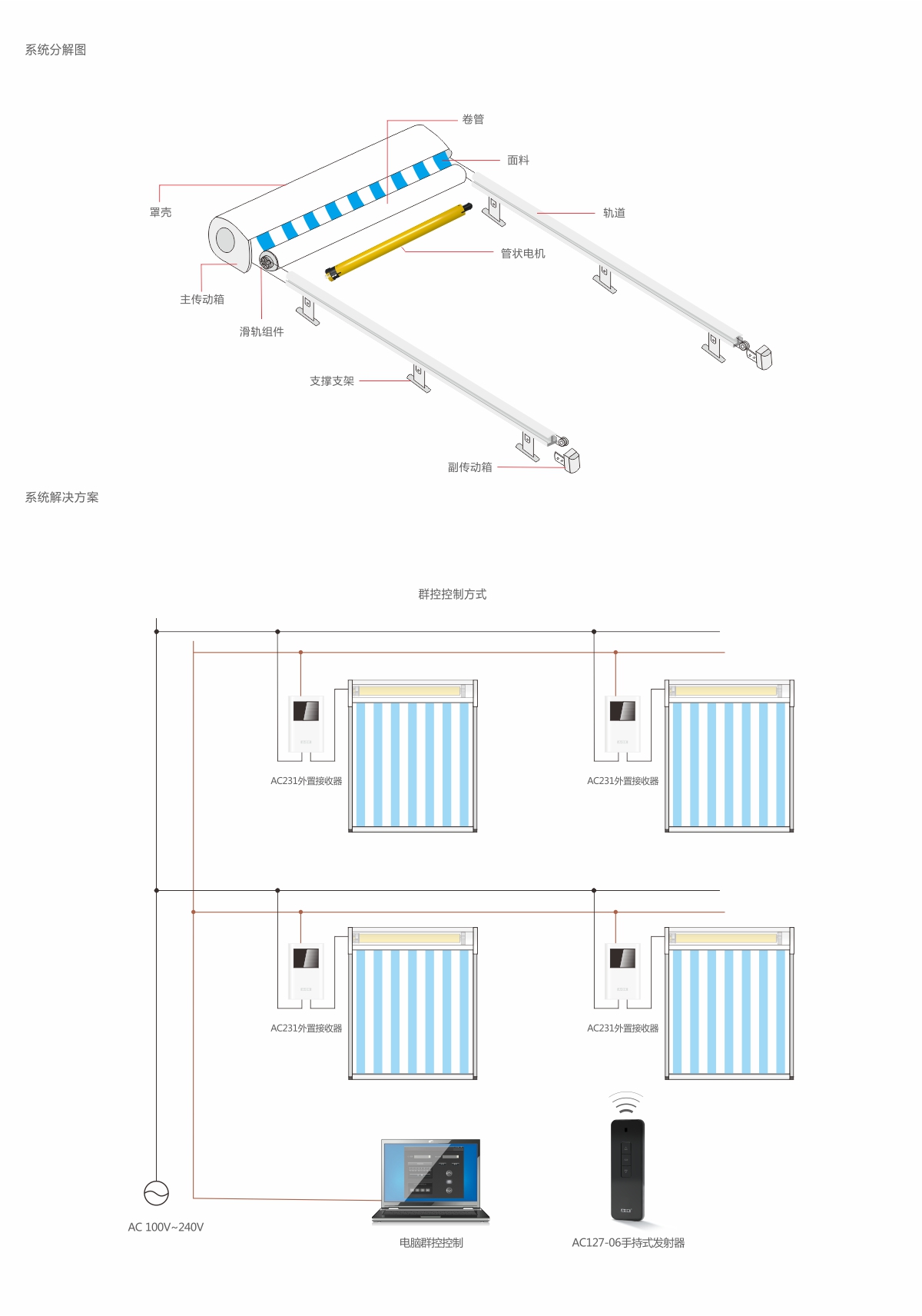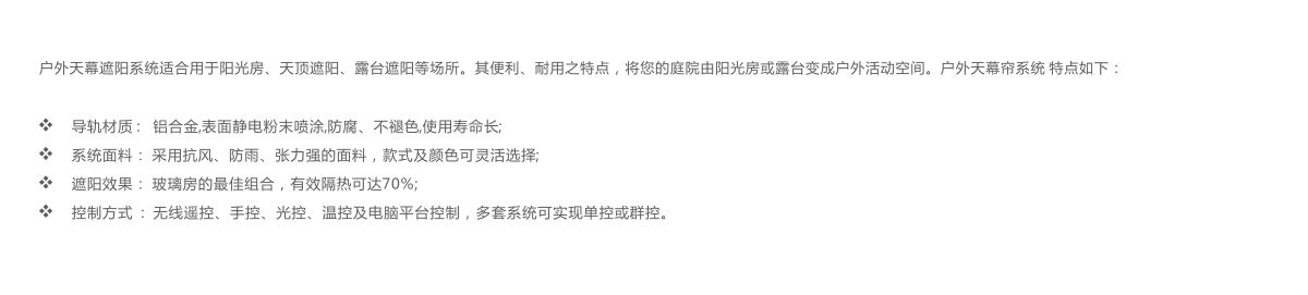 旭彩网 户外天幕遮阳系统采取双轨道,管状马达、无线操控、弹簧张紧系统、防雨罩及面料等部分组成,使用极为方便。