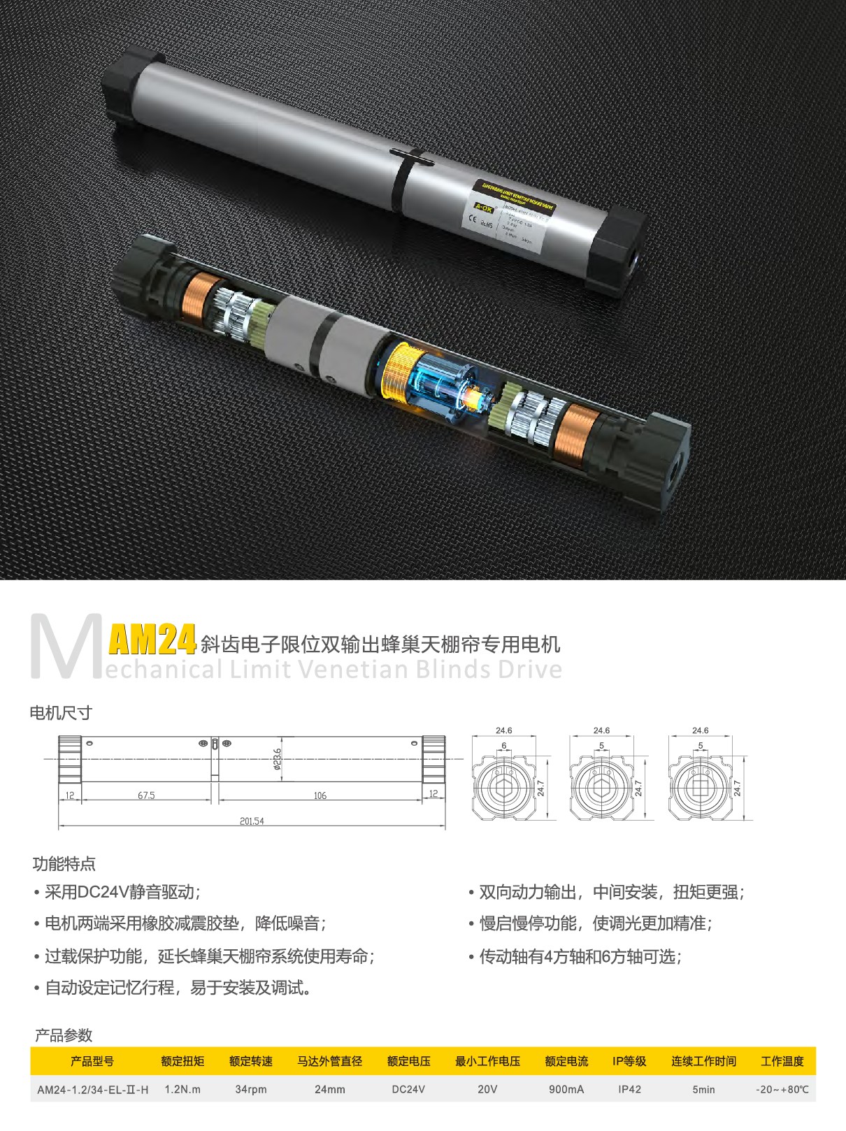 am24 斜齿电子限位双输出蜂巢天棚帘专用电机
